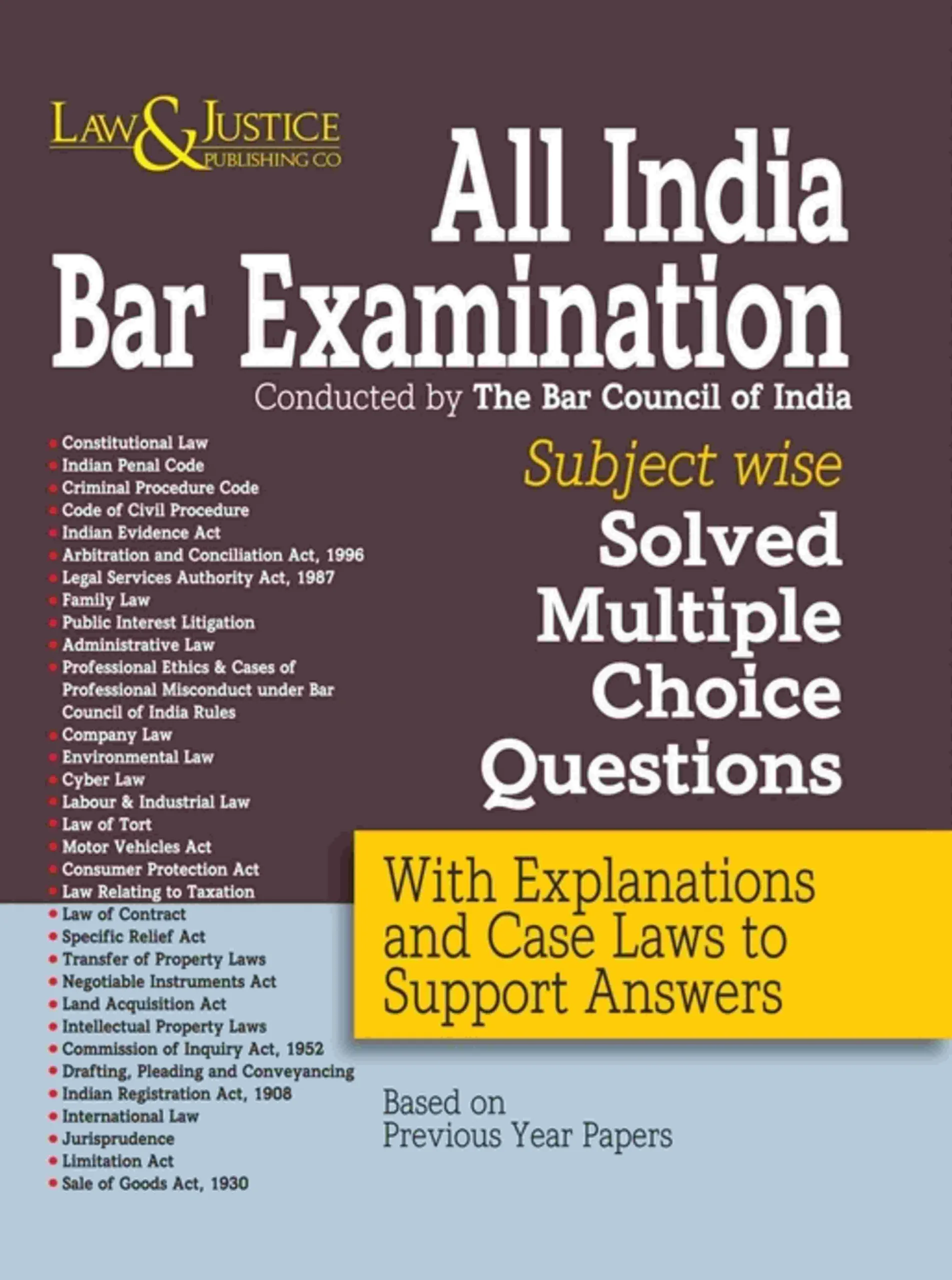 All India Bar Examination (Conducted by the Bar Council of India) – Subject Wise Solved Multiple Choice Questions, Edition 2023 is a comprehensive practice guide designed to help law graduates successfully clear the All India Bar Examination. The book presents a well-structured collection of multiple-choice questions, organized subject-wise to ensure systematic preparation and targeted learning. Covering all major AIBE subjects—including Constitutional Law, Criminal Law, Civil Procedure, Contract Law, Family Law, Labour & Industrial Law, Consumer Protection Law, Administrative Law, and Professional Ethics—the book enables aspirants to test their understanding of key legal principles. Each MCQ is solved with accuracy, helping candidates learn correct application of law and avoid common mistakes. The subject-wise arrangement allows aspirants to focus on weaker areas while reinforcing strengths, making it suitable for both first-time candidates and repeat examinees. Updated for the 2023 edition, the book aligns with the latest syllabus and exam pattern prescribed by the Bar Council of India. It serves as an excellent self-study tool and a reliable companion for last-minute revision, ensuring aspirants approach the AIBE with confidence and clarity.