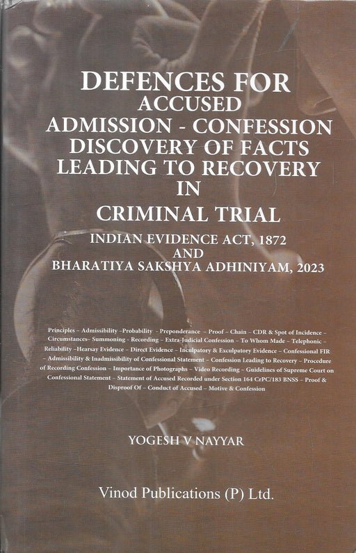 Defences for Accused: Admission, Confession & Discovery of Facts Leading to Recovery in Criminal Trial is an authoritative and practice‑oriented legal publication developed for advocates, judicial officers, law students, and researchers seeking an in‑depth understanding of criminal law, procedure, and evidence. The book explains important statutory provisions along with their interpretation by the Supreme Court and various High Courts. Through analytical commentary and structured explanations, complex legal principles are simplified for practical application in courts. The text highlights investigative procedures, rights of the accused, evidentiary standards, and procedural safeguards that govern criminal trials in India. Important legislative developments and emerging legal doctrines are carefully discussed with relevant case law references. In addition to doctrinal clarity, the book provides practical insights into litigation strategy, drafting, cross‑examination, and courtroom advocacy. This makes it an essential reference for practicing lawyers and prosecutors. The work is equally valuable for judiciary aspirants and law students preparing for competitive examinations, as it presents legal concepts in an organized and easy‑to‑understand format. Overall, this book serves as a dependable guide to contemporary developments in Indian criminal justice administration.